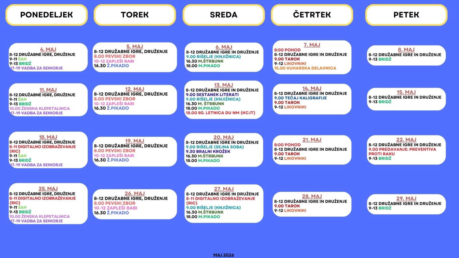 Mesečni razpored maj 2026 Društvo upokojencev2026-04-24T11:21:20+02:0024.04.2026|Mesečni program, Novice| Delite na socialnih omrežjih. FacebookXRedditLinkedInTumblrPinterestVkEmail