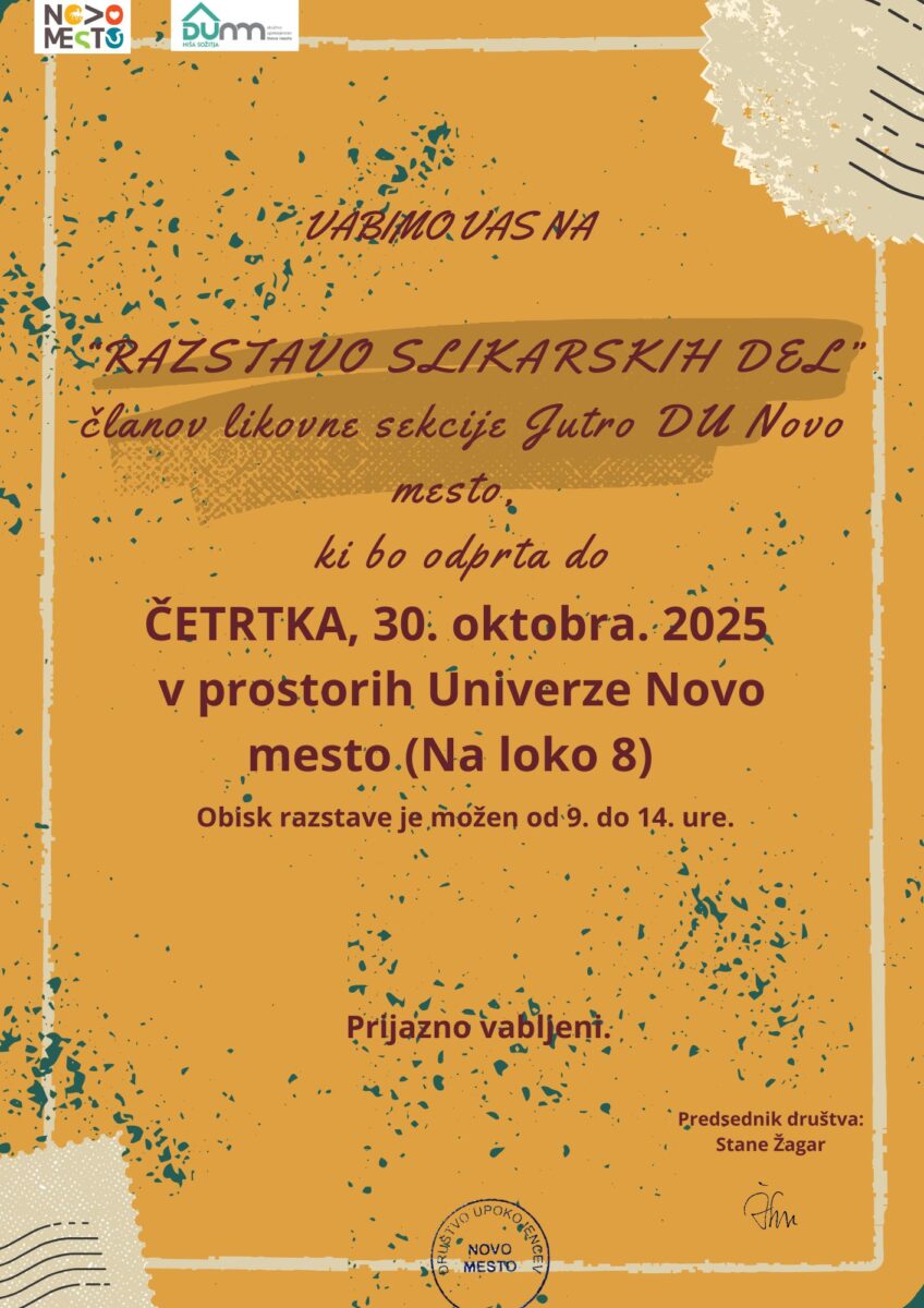 VABILO: Razstava slikarskih del članov likovne sekcije Jutro Društvo upokojencev2025-10-23T10:22:55+02:0022.10.2025|Novice| Delite na socialnih omrežjih. FacebookXRedditLinkedInTumblrPinterestVkEmail